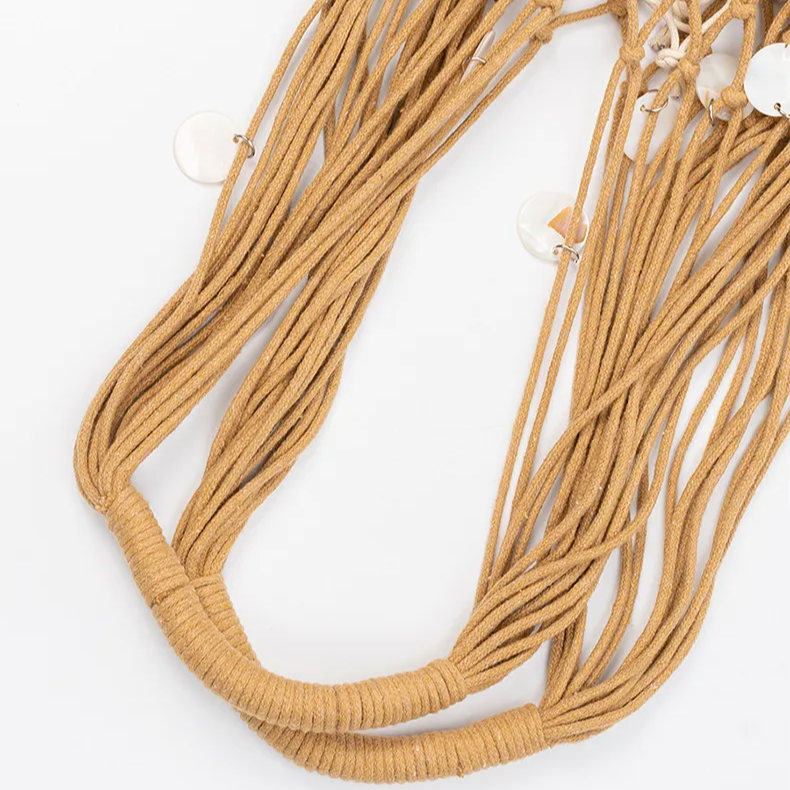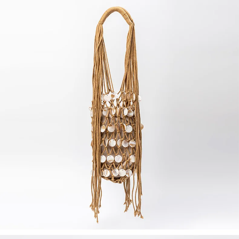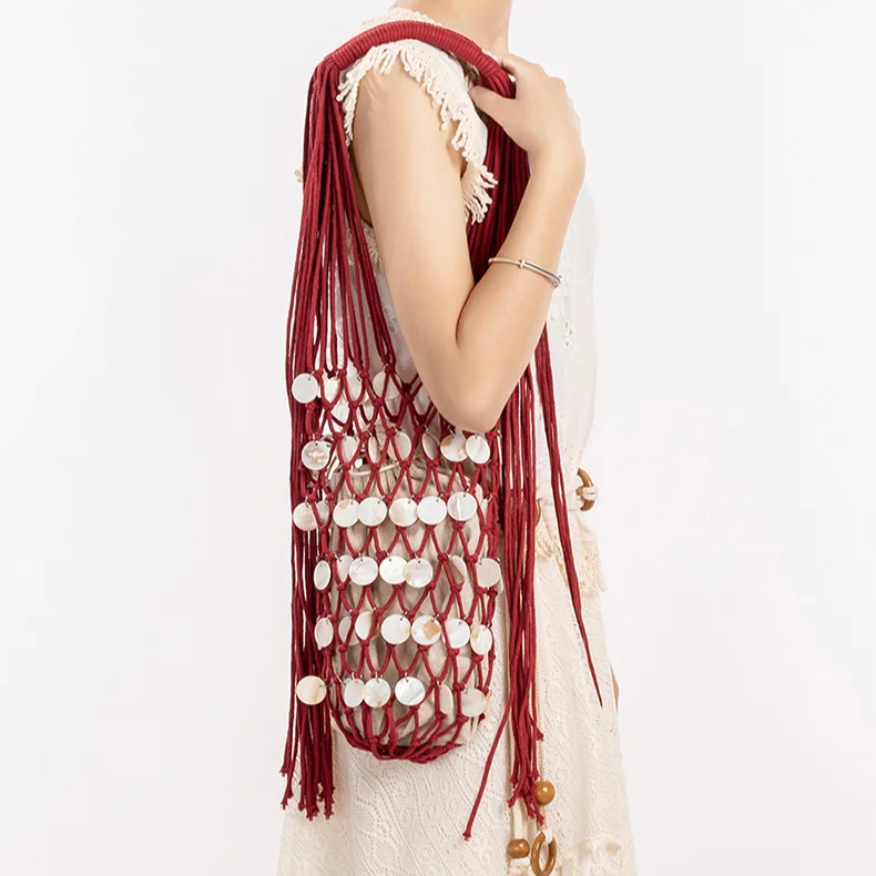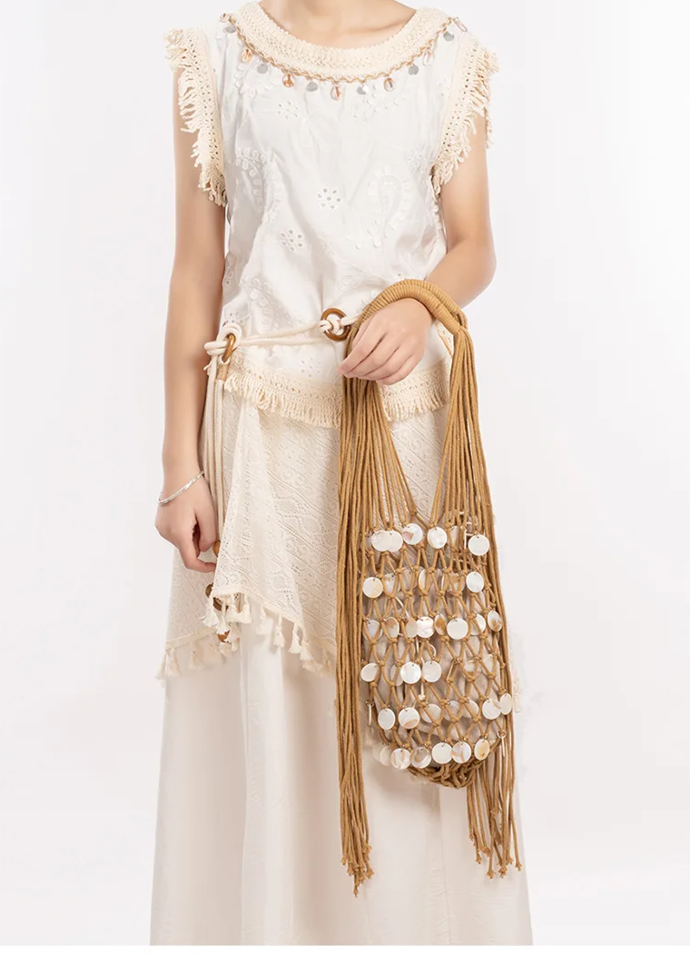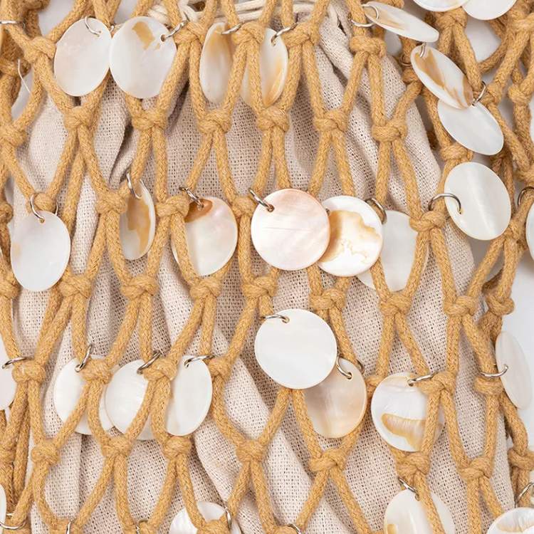 O interior é totalmente forrado em tecido macio, proporcionando proteção e organização para os itens pessoais. O fechamento ajustável por cordão alia funcionalidade e charme, mantendo a estética leve e fluida da peça. As alças em corda trançada artesanalmente garantem conforto ao uso e um acabamento refinado, valorizando ainda mais o design.